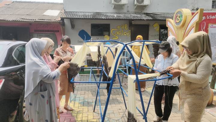 Terlihat, pelatihan ecoprint shibori tersebut diikuti puluhan peserta yang didominasi ibu rumah tangga dan kader Posyandu di lingkungan sekitar.